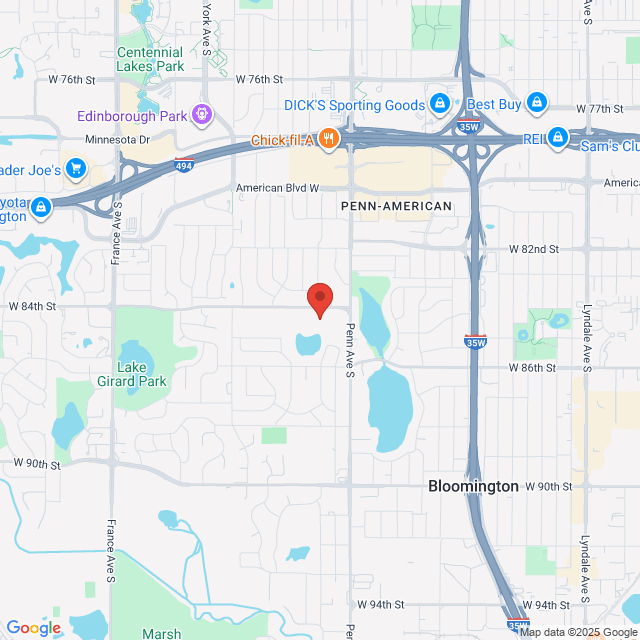 We are located at 2501 W 84th Street, Bloomington. From Penn Ave, enter the campus parking lot using the first entrance on 84th Street; if you are driving from the west down 84th Street, enter the campus parking lot using the second entrance on 84th. Keep left to navigate around the parking lot to access the rear SE lot. You'll enter the building at a glass entryway labeled door #7. Please feel free to use the designated patient parking near that entrance.